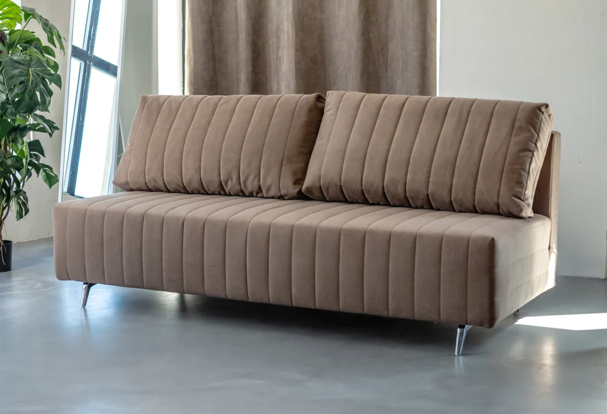 Декор чехла, высокая хромированная опора, отсутствие подлокотников создает современный и стильный образ. Компактные размеры и высокая металлическая опора – создают максимально функциональный и стильный диван, который легко трансформируется в полноценное спальное место.