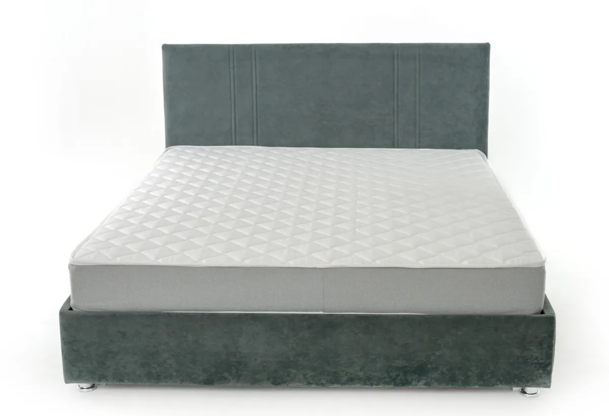 Мягкое, тонкое изголовье украшено двойной деликатной строчкой, царги затянуты основной тканью, каркас кровати установлен на хромированные опоры.