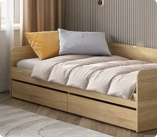 Комфорт и функциональностьСпальное место размером 900x2000 мм обеспечивает достаточно пространства для комфортного сна. Настил под матрас также выполнен из ЛДСП 22 мм, что позволяет выдерживать вес свыше 100 кг распределённой нагрузки. Это делает кровать идеальным выбором для тех, кто ценит прочность и устойчивость. Выдвижные ящики на шариковых направляющих не только добавляют функциональности, но и обеспечивают долговечность использования.